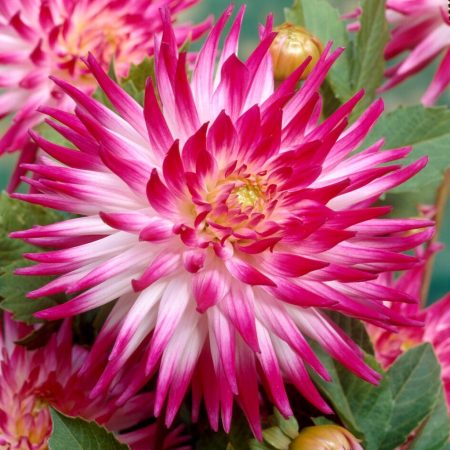 Fully double white cactus dahlia with magenta purple tips. The eyecatching blooms are up to 15cm wide with long, spiky velvety petals and the strong stems remain upright even in heavy rain Flowers from June to September Equally striking in a mixed border (plant in groups of 3-5), large container…